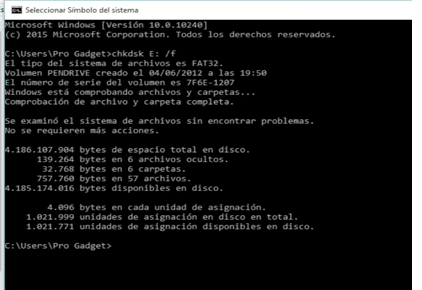 Ustedes tienen que colocar la letra en donde se encuentra su micro SD, USB, lo que están intentando reparar, cuando hayan terminado de escribir el comandó anterior solo tendrían que hacer clic en la tecla de ENTER y listo, solo dejan que cargue un momento hasta que el proceso termine.